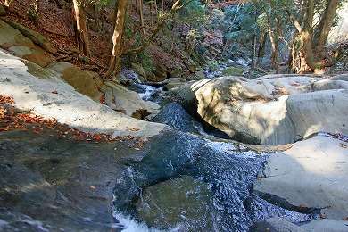 広沢寺温泉入口の駐車場より1km程行った所に大釜弁財天があります。3m余りの巨石が2つ、掌を合わせたように並んでおり、奥行4mの内部には七沢石で造った蛇の宇賀神(文政5年銘、とぐろを巻いた形)と高さ60cmのほこらの中にはいった弁天様が祭られています。その2つの巨石に前面には渓流が勢いよく流れ、直径1m50cmの一の滝壺、3m40cmの二の滝壷で渦となり次の1m50cmの滝壷、2m80cmの滝壷、2m50cmの滝壷へと巨岩を縫って落下しています。昔は7つの滝壷があり荘厳な眺めであったということです。