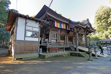 であります。宝形堂で斗棋の組み物や、十二支を素朴な彫りに飾った墓又等によった格調高い建築様式です。内陣には寛文十二年(1672)に旧飯山村の大工西海氏によって造られた厨子が安置され観音堂と共に重要文化財に指定されており、その中に本尊十一面観世音菩薩立像が納められている。