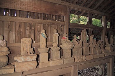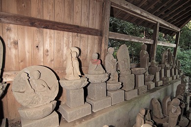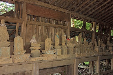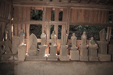 この石像達は、畑の中に埋まっていたそうです。そのためか、お堂のまわりに並べられています。