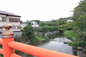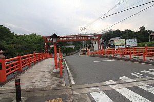 朱塗りも鮮やかな庫裡橋。現在の橋は、1999年に架け替えられ、飯山を訪れる観光客を迎えています。