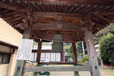 1618年鋳造とある梵鐘。三増合戦の時に義侠の死をとげた千葉金兵衛宗清の供養のために一族の者が奉造し、併せて徳川家康の冥福と秀忠の武運長久をも祈願したと伝えている。