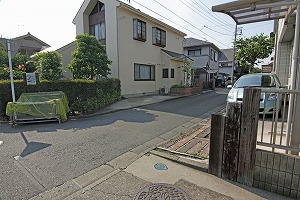 駐車場側から出ます。