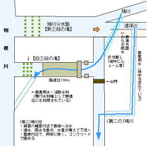 洪水対策として三段の滝を造り相模川に流していますが、農業用水なども必要なため、地中にも水路を造り、分水しています。