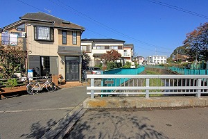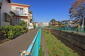 正面の橋を渡り、右へ(川沿いの遊歩道を行きます。)