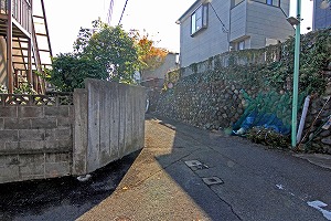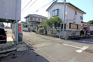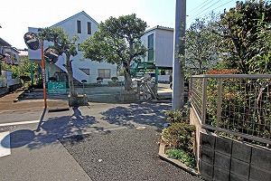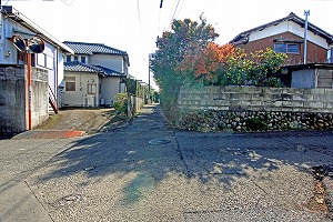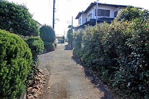 十字路交差点を真っ直ぐ、狭い道になります。