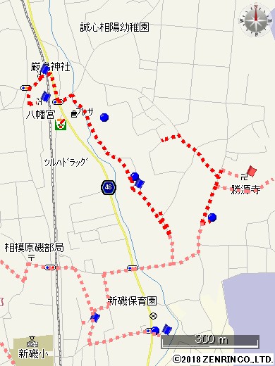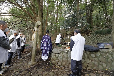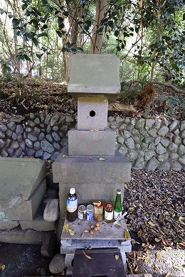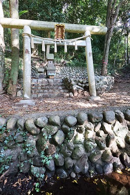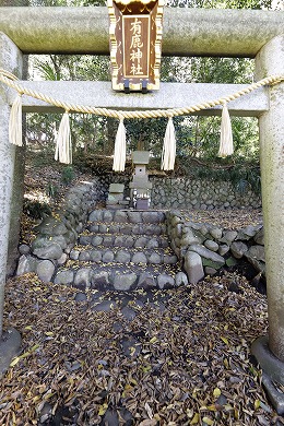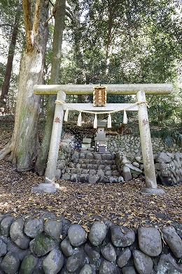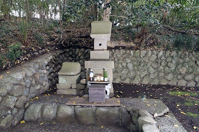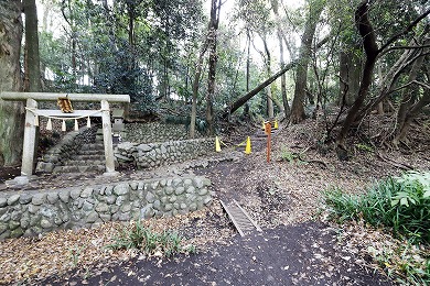 また、この小祠は海老名市の式内社「有鹿神社」の奥の院と言われています。「皇国地誌」には、「海老名村有鹿神社の神輿4月8日この地に渡御し、其霊璽(れいじ)を崖下の横穴に奉還し、6月14日本社へ帰興あり、此処に若干の社地があったが、明治9年廃して伐木した」とあり、海老名市の有鹿神社がご神体の石を勝坂の奥の院に預ける「水もらいの神事」が行われていました。この神事は現在も行われています。