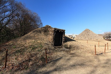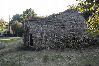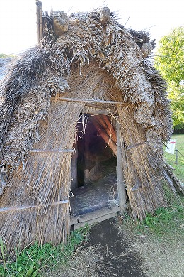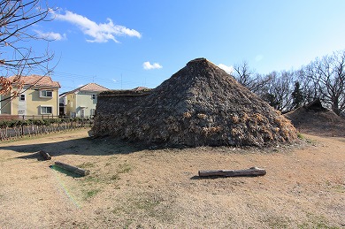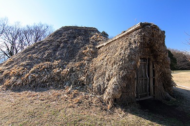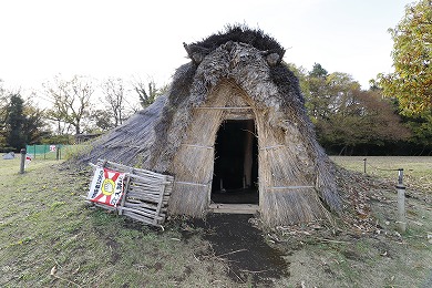 復元住居 屋根:笹葺 柱材:クリ床:ローム土