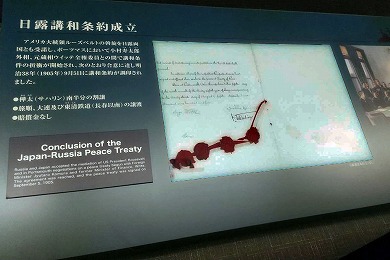 米国大統領セオドア・ルーズベルトの斡旋で、明治38年(1905年)9月5日に米国ポーツマスにて講和条約が締結されました。この条約に調印したロシア側は、三国干渉に関わった前蔵相ウィッテと駐米大使ローゼン、日本側は外相の小村寿太郎と駐米高平小五郎公使です。
