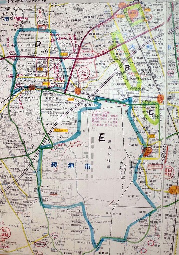 地図のうち緑色で面んだBが台湾少年工の寄宿舎があった所です。当時の大和村上草柳。ここから泉の森公園を抜けて、海軍工廠のあった青色のDまで毎日歩いてかよっていました。厚木飛行場はEの所で、当時は工廠と地続きでした。