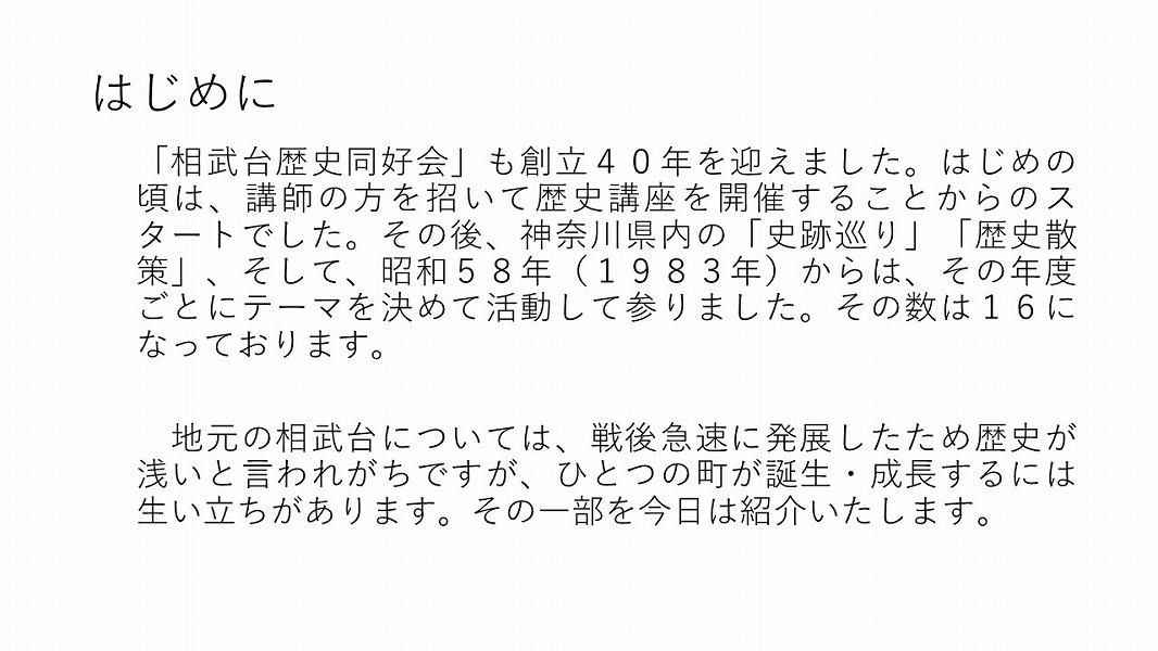相武台歴史同好会も創立40年を迎えました。はじめの頃は、講師の方を招いて歴史講座を開催することからのスタートでした。その後、神奈川県内の「史跡巡り」「歴史散策」、そして、昭和58年(1983年)からは、その年度ごとにテーマを決めて活動して参りました。その数は16になっております。 地元の相武台については、戦後急速に発展したため歴史が浅いと言われがちですが、ひとつの町が誕生・成長するには生い立ちがあります。その一部を今日は紹介いたします。