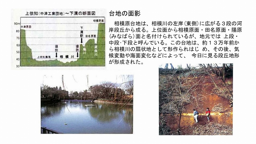 河岸段丘の実感できるポイントは「八景の棚」である。 JRの相模線は、標高30mの相武台下駅から終点橋本駅140mまで河岸段丘を登っていく。
