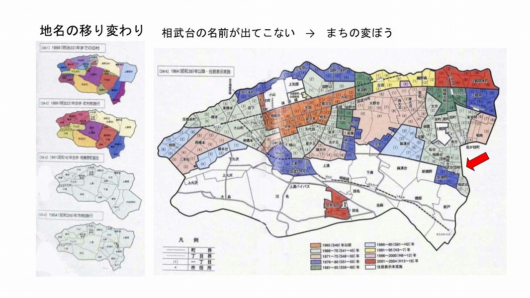 ・1951(昭和26)年1月には、大字下溝・新戸・磯部にまたがっていた旧陸軍士官学校練兵場跡地が払い下げられて、その区域が大字麻溝台と大字新磯野になった。
