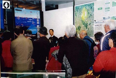 ④ はターミナルビルの資料室で来館者に説明する野間口室長(中央こちら向き)。資料室には飛行場の歴史をしのぶさまざまな展示物がある。
