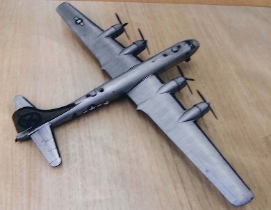 この写真の二つの模型は、昨年の展示会の時のギャラリートークで、中島又男氏が用いられたB29とゼロ戦の模型だが、両機とも別々の寸法基準によっているので、大きさの比較はできない。中島氏の話によれば、ゼロ戦でB29を迎撃するときは、最初のうちは斜め上から攻撃とされていたが、大戦末期には正面
